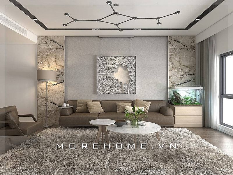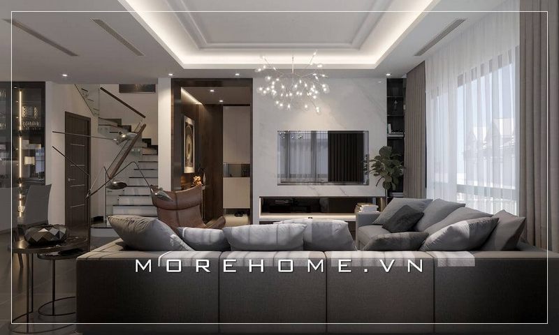 Mang đến mẫu thiết kế phòng khách chung cư đẹp với nội thất hiện đại tông màu trắng xám sang trọng và đẳng cấp được tạo bởi KTS MoreHome